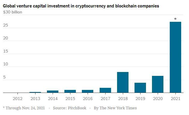 Separately, venture capital investors have bet big on crypto start-ups so far in 2021, investing more than $27 billion globally as of late November. This amounts to more than the previous 10-years combined, according to PitchBook.